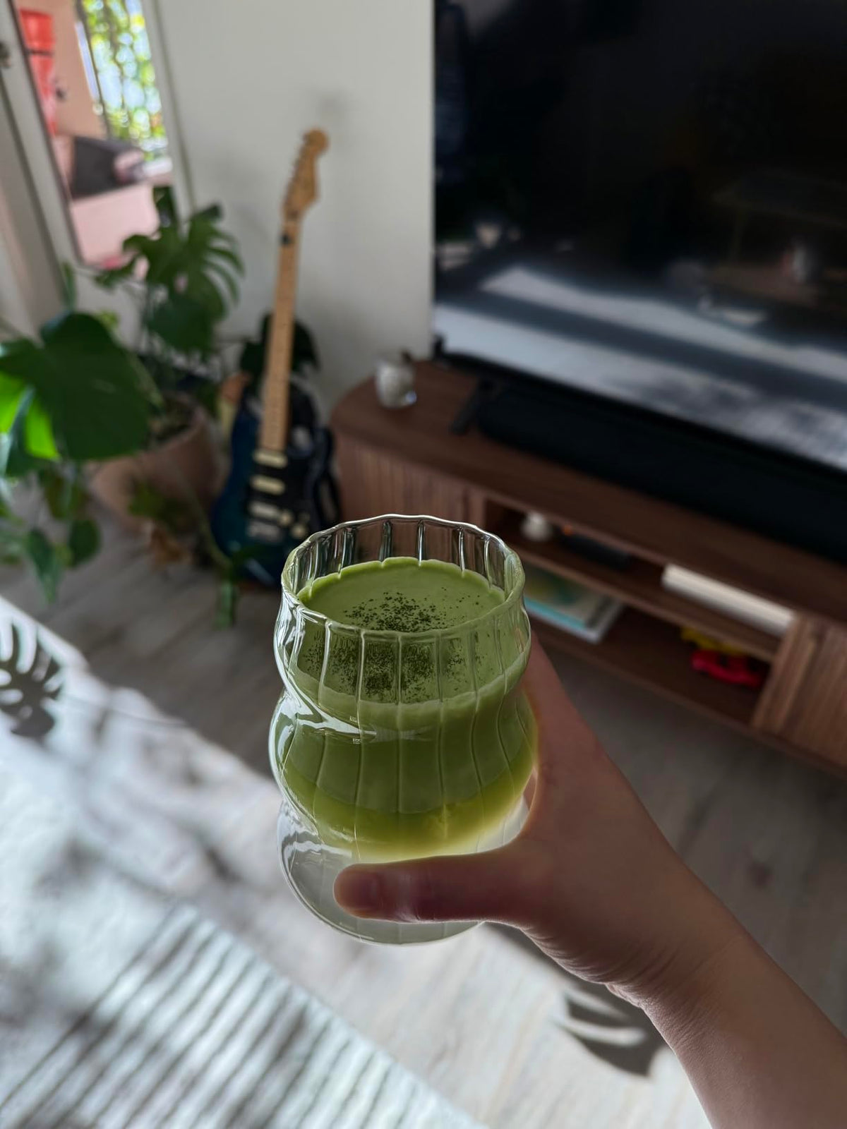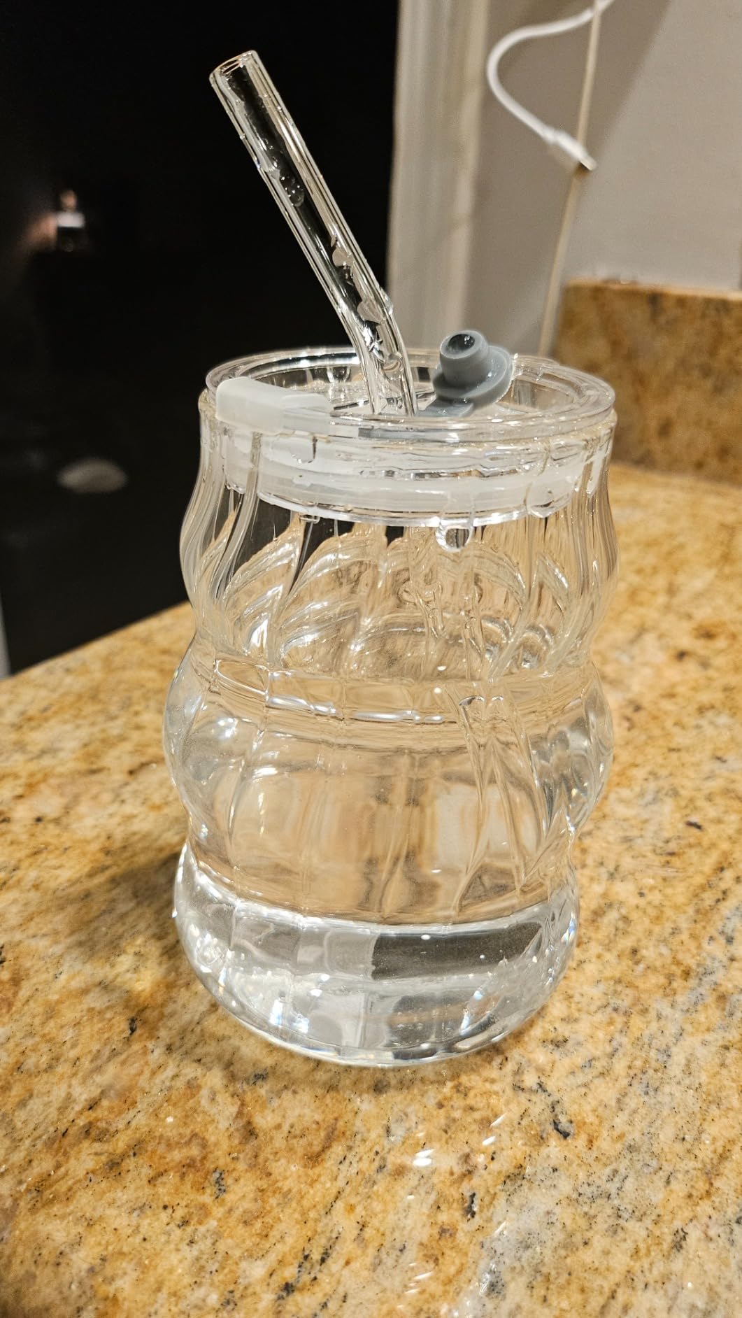Answer 1: The glass tumbler features a ribbed design that adds a soft, chic vibe, making it a beautiful addition to any kitchen or desk setting.