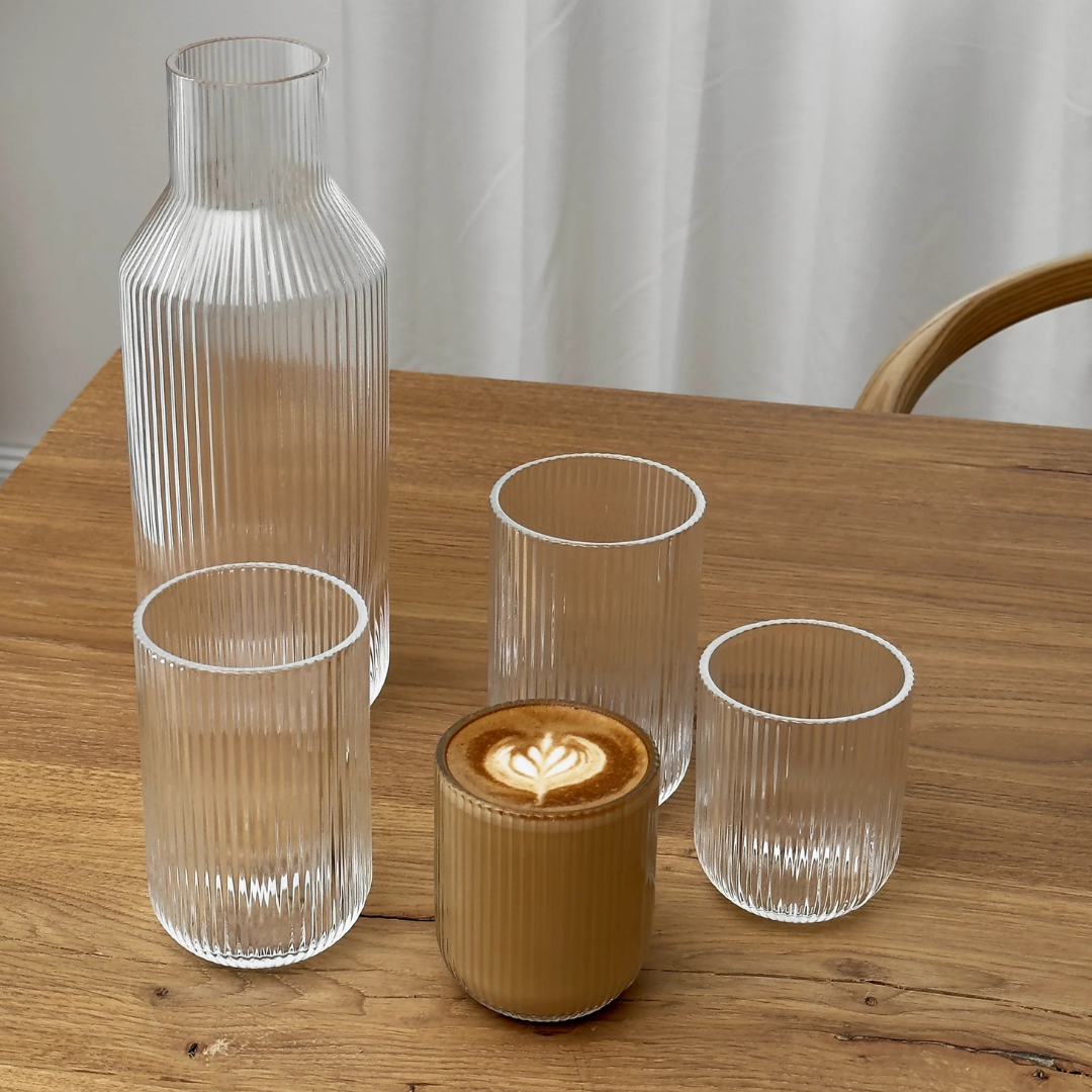Transform your daily sipping routine with this elegantly designed glass cup. Its ribbed texture and rounded base combine to create a stylish yet functional piece perfect for any beverage.